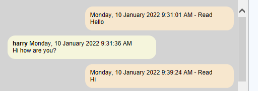 9. In this picture we can see messages from “Harry” on the left-hand side and messages we have sent him on the right-hand side. If they have already been read, they will be marked as ‘Read’ and have a light brown colour. If we have sent a message that has not been read yet it will look like: