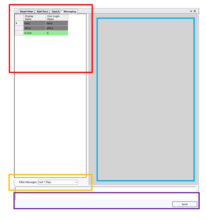 - (In Light Blue) MESSAGE DISPLAY - The message section where we will be able to see messages to and from users we select in the ‘USER SELECTION’.